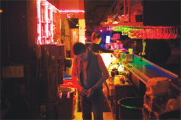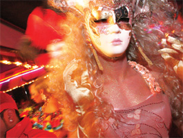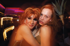While performers primp and prep backstage, some other tall girls, their pressurized chests exploding out of knotted tops, lean against the bar, beneath rows of hanging cognac snifters bathing in an electric green glow. Beneath metal palm fronds outlined in pink neon, jeaned lesbians and boys with spiky hair dance with each other to South American diva pop, alongside straight couples and some that could pass for straight from a distance. Enrique the bartender shakes to the beat as he chills a drink. The music changes and a procession of exaggerated femininity parades under the lights. "Happy Birthday, Mr. President," Marilyn lip-syncs as an industrial fan blows her dress over her face. A heavy set spiderwoman catches a web's spoke on a photographer's leg. Willowy Miss Venezuela, sprouting pastel plumes of yellow, baby blue and purple, spins with arms outstretched, glittering, sparkling, shining under the rotating light ball. The crowd cheers, laughs, whistles, yells, applauds.