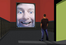 The best pieces break the human/object dynamic of the usual museum display mode. Love Disorder, by Bruce Charlesworth with Colleen Ludwig, occupies a whole room, polished wainscoting below, flat-red walls above. At the far end of the room, a giant screen projects in tight close-up the face of man—Big Brother from 1984 jumps to mind. As you walk around in the room, sensors track your proximity to the talking head, which alternately cajoles, entices and then scolds you with a litany of phrases designed to induce emotional vertigo.