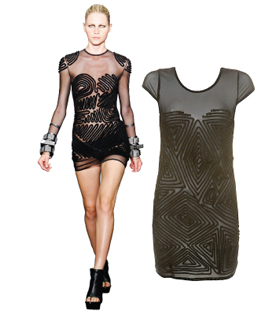 Forever 21 in particular has been sued over copyright issues more than 50 times in the last four years by designers ranging from Diane von Furstenberg to Gwen Stefani, but it still hasn't changed its approach to merchandising. Dior, Alexander Wang and Lanvin are among many brands being obviously ripped off this season. Wang's see-through black minidress retails for $1,100, but at Topshop.com a very close match with a slightly different pattern is a mere $90. Dior's Diorette cocktail ring ($5,000-plus) can be found from Fred Flare, who sells a nearly identical faux babble online for $24. Then there is Lanvin's $2,875 lacquered metal navy necklace, which has a doppelganger at Forever 21 for $12.80.
