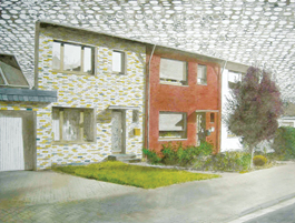 In Constructed Memory, Jim Campbell re-creates the troubling time when his childhood home burned down. A translucent photograph of a simple clapboard home is illuminated from behind by a grid of miniature LEDs that produce a rippling flamelike pattern. Ghostly images of cars in the driveway and a kid's bike add to a sense of fleeting presence balanced with unobtainable absence, as in a dream. Stefan Kürten's large oil Clouds depicts an attached row of brick-front houses. A closer look reveals that these beckoning dwellings are actually a facade, a quickie movie-set memory of home.