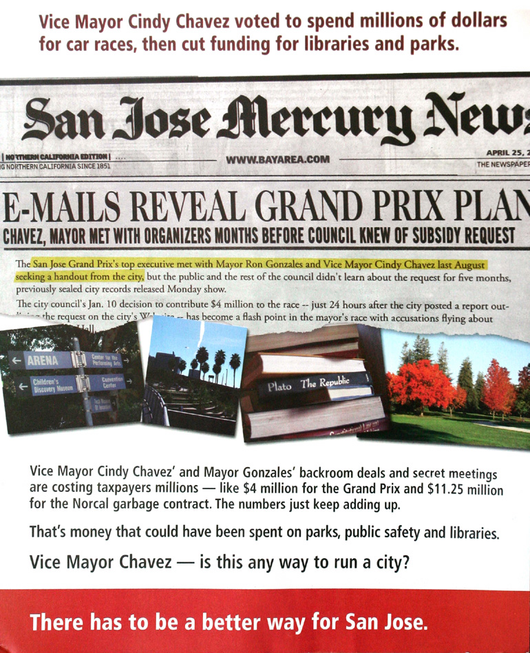 Berg's team drops the first group of mailers at the post office. One piece contains an image of the Mercury News article about Chavez's meetings with Grand Prix promoters. "Scandals, secret backroom deals and wasteful spending—that's just not the way to run a first-class city," the flier declares. "Why does Cindy Chavez want to spend money on a downtown car race, while cutting funding for parks, libraries, and community centers?" Another flier features an image of Jose Mendoza, a business owner in the Tropicana Shopping Center who almost lost his store to the San Jose Redevelopment Agency through eminent domain. "Cindy Chavez voted to take away my business and property so she could give it to a rich developer," his quote reads, "I think she was wrong." Over the next two weeks, 300,000 of these fliers will be mailed to San Jose voters.