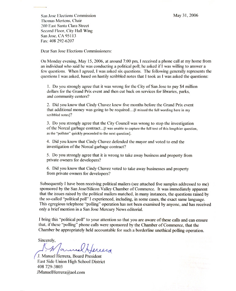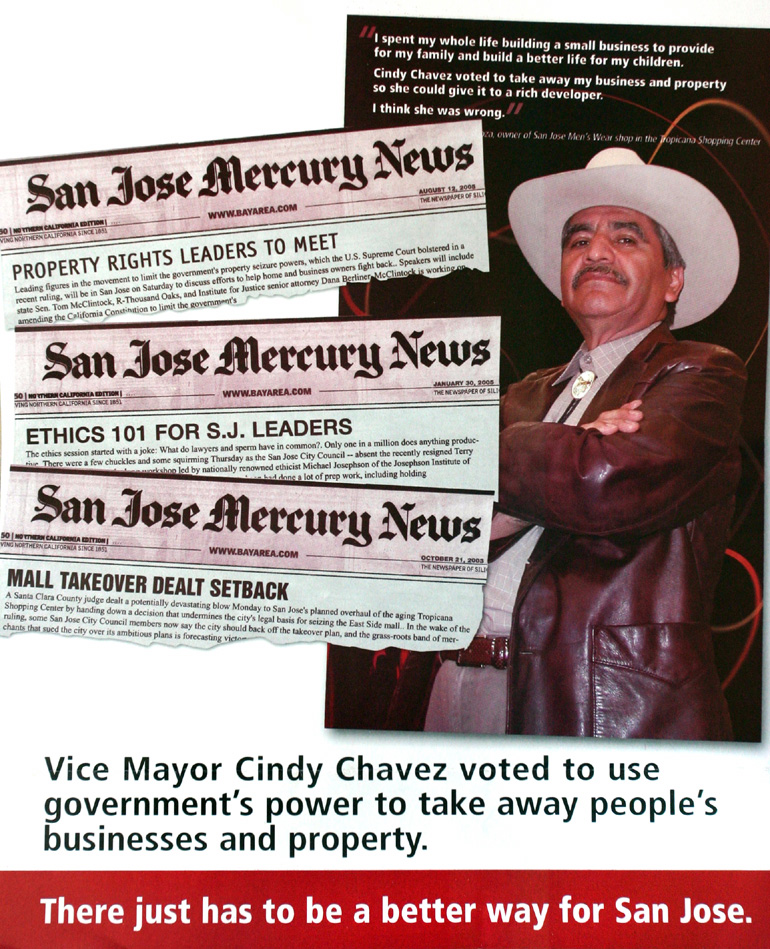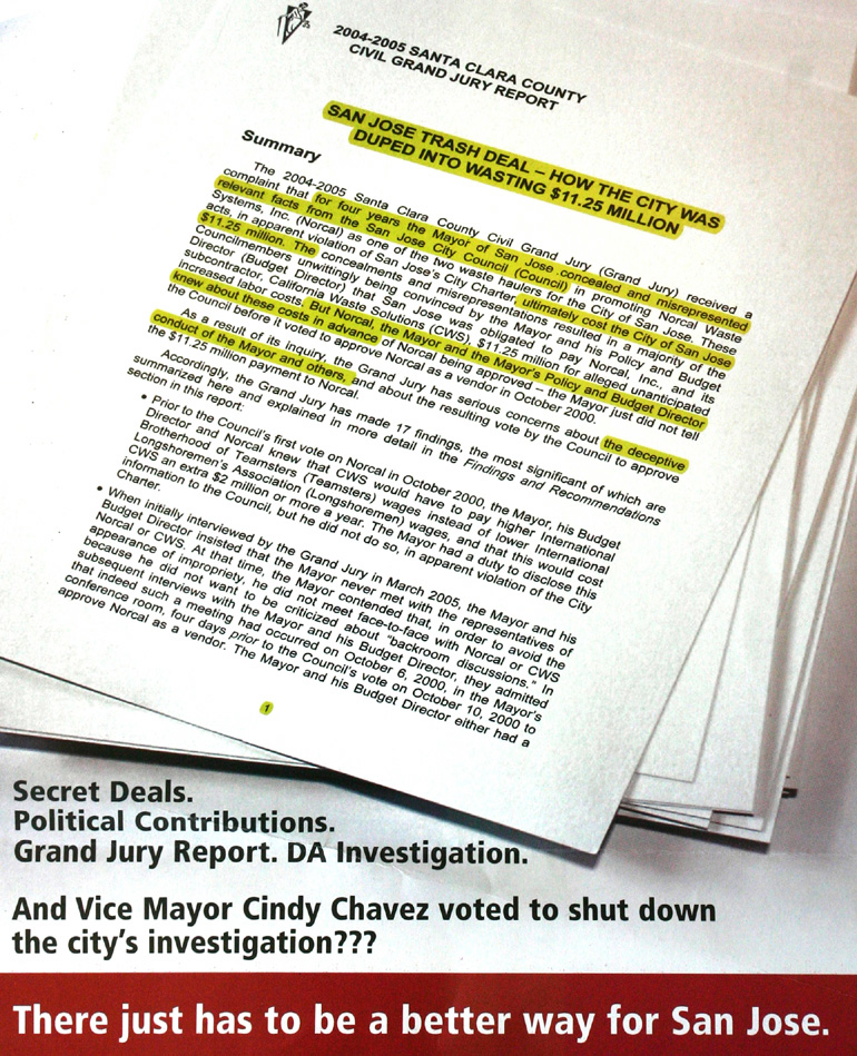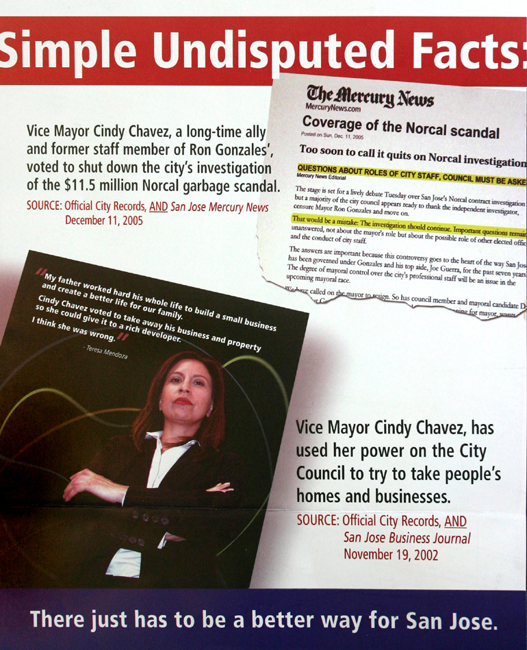 The San Jose Chamber of Commerce drew fire from Chavez's supporters after mailing out 300,000 fliers to San Jose voters. See eight of these fliers.