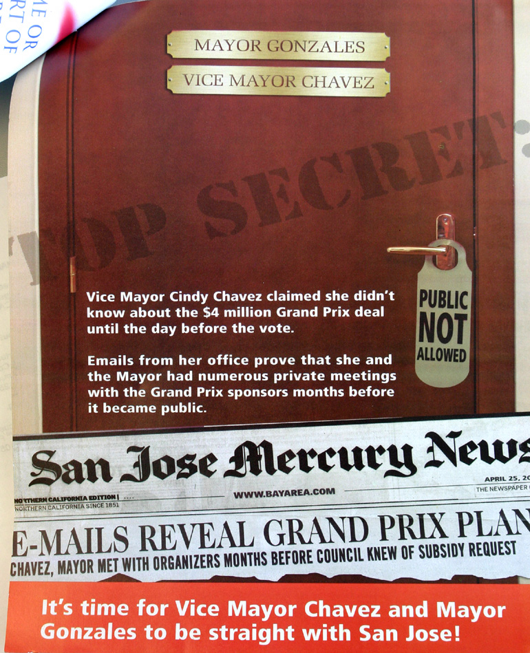 The Mercury News reports on San Jose Vice Mayor Cindy Chavez's secret meetings with Mayor Ron Gonzales and Grand Prix promoters. In January, the council had made a rushed decision to approve a $4 million subsidy for the downtown event—unaware that Chavez and Gonzales had discussed the matter five months earlier.