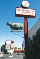Lincoln Glen Center is a masterpiece combo of oddball stuff—the quintessential wasteland strip mall that looks like it's been thrown away like yesterday's newspaper. The Sherwood Inn sits right there and it's not an inn, it's a restaurant. But the best thing is the large green-and-white cow that sits on top of the restaurant, overlooking the expressway. The cow has been there for decades and it wasn't always green. It used to be black. Nevertheless, the cow is a San Jose landmark.