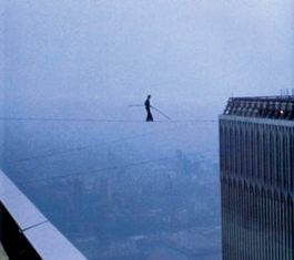 IT'S A LITTLE SLOW, the first half-hour of Man on Wire by James Marsh. Stick with it, though, because the slight complications in the setup are small compared to the glory of Philippe Petit's 45-minute walk along the edge of infinity between the Twin Towers in New York. It happened on Aug. 7, 1974: a stroll of 200 feet, with the fine chance of a fall 1,776 feet straight down. Petit planned this caper—"Coup" is the word he used—well. So well, despite it all, the setup has a slight routine quality. If the planning didn't go like clockwork, at least it went without major hitches. No one on Petit's team developed a sudden heart condition or turned out to be a police snitch, as in the heist movies the acrobat loved. The early part of the documentary shuttles between the planning stages and the long night before the event itself. It's amazing enough that Petit did this stunt. Maybe it's more amazing when you learn he didn't sleep the night before. Petit is a physically small man, now wizened, but still with a resemblance to the Malcolm McDowell who put up such a fight against authority in 1960s cinema. A Parisian street performer, Petit carried out his most unforgettable stunt after starter capers, like walking between the towers of Notre Dame de Paris and strolling in the air between the pylon and the crest of the Harbor Bridge in Sydney. Fortunately, Petit kept movies of both these events and of the planning stages of the New York event. His headquarters was a pasture in Auvergne. We see him driving a tractor past a dirt-road turnoff, marked by a cardboard placard: "World Trade Center Association." In this pasture, Petit and his team solved one problem that haunts the mind ever since first hearing about this stunt: How the hell did they get a cable across? (Answer: bow and arrow and monofilament attached to a rope attached to a cable.) Man on Wire—the title comes from the deliciously terse NYPD police report—begins to accelerate, finally, as Petit's lover, Annie Allix, describes her own fears. She was nervous about the quality of Petit's helpers: one was "fumé"—stoned on marijuana when she met him. And at the end, it's her eyewitness account of Petit's space walk that tears us up the most. Sometimes we lose the one we love through death. Sometimes, it's through near-death experiences.