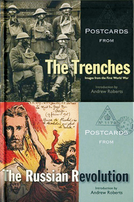 "Wish you were here." The ur-sentiment of postcard scribblers since vacations immemorial doesn't always apply. The average traveler—unless we're talking about John Reed—might not want to be caught up in the chaos of the Russian revolution or the slaughter of the trenches in World War I. And yet, as demonstrated in these two postcard-size collections of period postcards, there truly exists a card for every occasion, even insurrection and mass warfare. Postcards From the Russian Revolution samples sights from three uprisings: 1905, February 1917 and October 1917. The images range from touristic photo ops (the Winter Palace) to royalist kitsch (family portraits of the Romanovs just four years before their fall) to miniature propaganda posters, both Czarist ("The soldiers at the front are dauntlessly holding the line against the enemy. ") and Marxist (a shot, possibly altered, of Lenin chatting up workers in Red Square). On the flipside of some cards we can read firsthand briefs from history, including a message penned a day after the emperor abdicated. The volume ends with a baby picture of a chubby-cheeked Lenin—who wouldn't want to find that in their mailbox? The Postcards From the Trenches tend to be a bit starker, although an air of optimism clings to posed images like "Tommies at Work," depicting British soldiers crouching in a verdant forest; a postcard in which French scouts roost in a bare-branched tree demonstrates how quickly the shelling reduced the landscape to rubble. A few colorful cards are designed for home-front morale boosting, but most are sepia-toned images of battle. A French card shows skulls and scattered helmets at Verdun. As the accompanying text comments, "It is difficult to imagine someone sending this postcard." (Introductions by Andrew Roberts; Bodleian Library, distributed by the University of Chicago Press; 96 pages/112 pages; $20 each, hardback)