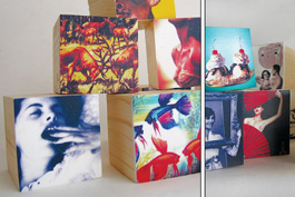 Janet Fine takes a more humorous approach, playing with the whole idea of sin. Her Seven & Seven consists of two wooden boxes, one labeled Deadlies, the other Sicklies, into which various wooden cubes with advertising and magazine images glued to them can be inserted by the user in a game of mix and match. Fine's witty Sickly sins are "Moral majority, white lie, road rage, identity theft, potty mouth, friendly fire and corporate homogenization."