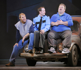 Thematically, The Full Monty explores the concept of manhood in a place where men are fiscally impotent. The musical version is set in Buffalo, N.Y., where the steel industry and all the jobs it provided has gone soft, leaving hardy factory men to work cushy security-guard jobs in malls. The story focuses on three characters. Jerry Lukowski (Jim Newman) is the divorced dad who can't afford child support for his son; Dave Bukatinsky (Eric Leviton) is Jerry's chubby sidekick, whose self-esteem has bottomed out; and Harold Nichols (David Gunderman) is the doting sophisticate who can't keep up with his wife's spending habits. Inspired by the long lines and plentiful cash at the local Chippendale's, they, along with Malcolm McGregor (Alan Swadener), Ethan Girard (Ian Leonard) and Noah "Horse" T. Simmons (Keith Tyrone), put together a strip show to make some extra money.