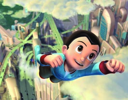 IT IS suggested that the Japanese are the world's greatest consumers of comics due to a proud tradition of graphic simplicity and sophisticated woodblock prints. Could we say that animism might be the reason why the Japanese seem so particularly open to the question of whether a machine has a soul? "God of Cartoons" Osamu Tezuka deserved that title in the Japanese comic book and animation industry. He was a Walt Disney who surpassed Walt in the range of his material. His most popular character, his Mickey Mouse, was Astro Boy. The flying robot's starlike cowlicks were even set at the same angles as Mickey's ears—or so Tezuka confessed once. It's surprising how much of Tezuka there is in the film Astro Boy. The CGI venture preserves the winning personality of the undersized hero as well as his look (though he is attired a little more modestly in 2009). While moving like an action picture of today, the graphics salute 1960s manga and anime. Tezuka's favorite caricature of himself—beret, beatnik beard and round worried face—turns up in the crowds. Further retroness shows up in the Mary Blair–style graphics of a documentary, explaining the history of Metro City and of the robots it uses and trashes.In the future, the art deco Metro City floats in the sky like Jonathan Swift's Laputa. Its dictatorial president (Donald Sutherland does the voice) is trying to arrange a war to ensure his victory in the upcoming election. During a demonstration of a new form of atomic power, the son of the city's greatest scientist (Nicolas Cage) is vaporized. Griefstricken, the scientist tries to reincarnate the boy in powerful robot form. Like Dr. Frankenstein, he rejects the creature that results. Stranded in an underworld of the poor and discarded, Astro (Freddie Highmore) learns how the other half lives, before returning to the city of his birth to defeat the power-mad leader. But there's a modern romance, of sorts, with a streety girl child named Cora (Kristen Bell), who wises up Astro to what life is like in the shadows.