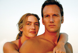 Just as Madeleine in Vertigo emerged in a blur of green neon light, in one moment Winslet's eager face is suffused in a wavy turquoise glow reflected from the swimming pool. "Hot enough for you?" asks Sarah, during one loll on the towel next to Brad, this perfect physical specimen she is convinced that she loves and must have. Yes, definitely, hot enough.