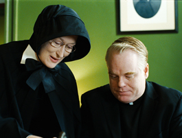 The acting is theatrically grand. Streep tears into the material, and Hoffman shivers the timbers with his voice during a parable about gossip. He uses an Irish accent that, at first, seems to be comic. Then it takes an about-face into roaring seriousness. It's the kind of acting you feel in your spine instead of your brain. Later, though, it seemed that Brendan is a part that would have been better in the hands of someone sneakier. James Cromwell comes to mind. Longtime Hoffman watchers wouldn't have trouble suspecting one of his characters of pedophilia. The subject of the story is doubt, and Hoffman doesn't inspire that; he's played the bottled-up pervert so many times that we can't take his friendliness at face value.