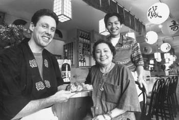 Heaven's Gate: Paradise Sushi chef Joe Stagno (left), owner Ellen Saranyaphiphat and her son Ning are tickled pink over their sumptuous display of rolls and wasabi.