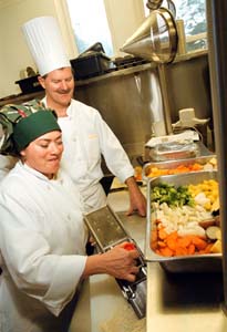 Think about it: Everything these students are doing is part of their grade, all watched over by the expert and demanding eyes of Sue Slater and Carter, who between them have many, many years of kitchen expertise. (Eric puts on another hat next week at the annual Clam Chowder Cook-Off, where he'll be a judge.) Nothing comes out of those swinging kitchen doors that isn't exactly what it's supposed to be.