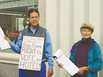 Reached by phone, BILL MALONE, who is the volunteer coordinator for SANTA CRUZANS FOR RESPONSIBLE PLANNING, said the mixed messages had been dealt with. "We were notified that was happening," says Malone, "and we immediately went after the petitioner and asked him to stop doing anything but the Coast Hotel project."