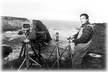 Ruble's been here since four o'clock this afternoon setting up cameras in places mountain goats fear to tread. On one such spot--the edge of an ice plantthronged bluff plunging 60 feet to the hard-packed sand below--a bank of four cameras balance on spindly tripod legs. Down on the steep trail to the beach, he's set up three more and opened all the cameras' shutters.