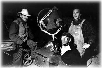 So it's really quite charming to watch three distracted and aging hippies working feverishly in the dark to get Big Light safely over the prohibitive rope and back on her three squeaking wheels so they can get on with the elastic photographic process they call a Power Flick.