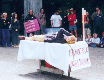About 250 nonsenate faculty, lecturers, students and supporters marched from Stevenson College to the chancellor's office headed by a student on a gurney hooked up to an IV. Asked why he was thus prostrated, Ben Wilkins-Malloy, a Cowell student, said he was a "symbol that UC's attitudes to nonsenate faculty are threatening the educational health of the system, as represented by students whose teachers keep changing or are overworked, underpaid and not respected."