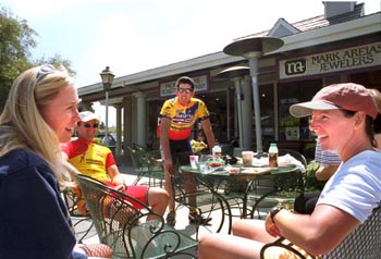 Greg and Cathy Freyberg take time for a jolt on the patio of Pacific Coffee