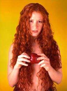 With its blatant biblical reference to Eve and her god-forsaken apple, the picture in question features Storey standing naked from the waist up with an apple in hand, slightly opened lips and a, er, meaningful gaze--she embodies the archetype of the not-quite-innocent seductress. It's a loaded shot, one that I think could use a bit of explanation from a woman who toured on the Lilith Fair. More than just another pretty Eve, the fiery-headed temptress explains that the picture is very meaningful, conveying themes of temptation and innocence from her latest eponymously titled album.