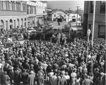 Political Rally, Feb, 15, 1950: As old-timers can attest, this was the way Pacific and Cooper streets looked back then. Democrat Jimmy Roosevelt was running for governor. Joe & Joe Lucca's restaurant was in the Metro Santa Cruz office. Don Morris' Chrysler/Plymouth dealership and Price's Auto Body Works were where somebody let developer Bob Swenson build the Galleria, which is more or less standing today and where our former locally owned Coast Commercial Bank does business. Yes, that's the real Cooper House on the immediate right, and yes, all male Democrats wore fedoras in those days.