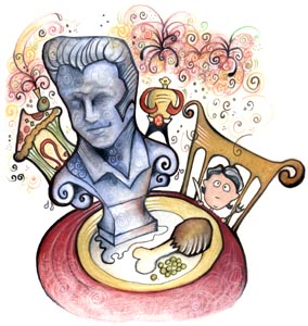 How about a Thomas Kinkade village made entirely of Gummi bears and tofu? Wouldn't it be rad to create celebrity garnishes--Pam Anderson buns with Bing cherries on top, or spun-sugar loose cannons sprinkled with Jack Daniels in honor of George W. Bush? A Jesse Ventura fetish of round white turnips wearing little licorice wrestling belts. Go beyond postmodern and put adorable little wasabi rabbits in tomatillo cups. Live a little!