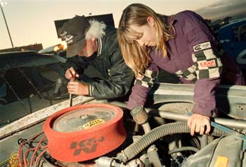 Girl in the Hood: Her husband's father and prized pit-crew member 'Big George' (left) helps Watsonville's first female Mechanic of the Year prepare for her next race.