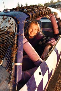 With a slumber-party-like excitement, we page through photographs of her races. Many are freeze-frame images of her cars' worst crashes. In one picture, a wayward competitor crumples her driver's door; another shows her car spinning across the track, its entire front end bashed in accordion-style.