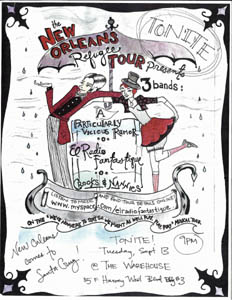For the members of El Radio Fantastique and their tour mates, this excursion is a bittersweet farewell to a scene that is destined to break apart as soon as the final date of the tour is played. The entire posse is now homeless and it's going to be very hard to keep a seven-way long-distance relationship going. The group's monumentally talented drummer, Kid Twist, who also plays in Crooks and Nannies and A Particularly Vicious Rumor, is heading to Europe for the short term, but does not plan to return to Louisiana. June and Johnny Dimorente are moving to the Bay Area.