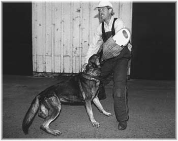 Also here tonight is Rich Cabana of the Monterey County Sheriff's Department with a sable female named Sadie. Although Sadie squeaks rather than barks--"It's not very intimidating," says a forlorn Cabana--she shows up the boys in drive and aggression, running hell-bent and biting hard, even through the sleeve.