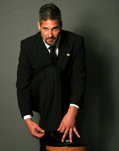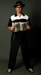 In his makeover photo, Ryan is wearing a Da Vinci retro black with white stitch crest shirt ($50), with a New York Hat Co. felt fedora ($40) and faux alligator shoes ($40), all courtesy of Cognito Clothing owner Annie Rains at 821 Pacific Ave., Santa Cruz; 831.426.5414.