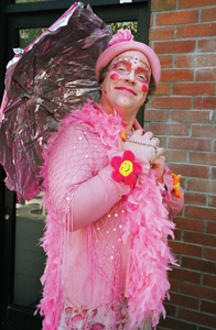 To finish off your own Umbrella Man look, don't forget the pink knitted hat with pink flower, Mardi gras beads, pearls--oh, and of course, a pink Tweety-bird decorated, Velor-lined umbrella.