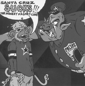 The cover illustration features a skater punk monkey being accosted by a hovering officer of the law, with chain stores looming in the background. But if the success of Santa Cruz Sucks! continues, the wave of the future may not be $50 CDs, but more indie compilations of local musicians.