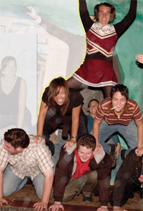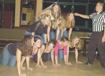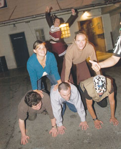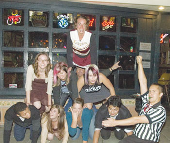 Only now am I beginning to realize the true prowess of the Brandinator's powers of persuasion. The Red Room, devilishly lit as advertised, was smoky and packed with ultrahip college students. Dressed as a referee, I wasn't blending in. We pushed past the throngs gathered around the bar to the backroom where people sat comfortably low in their seats around tables covered with drinks. In short, they looked unmovable. The Brandinator sprang into action, working her way through a group of guys in the center of the room. Sadly, more than one had a "bad back," but most of them happily pointed out a friend who might be more able. My efforts were shot down with a "Cool man, good luck with that" torpedo, but the Brandinator was more successful. Shouting above the din of indie rock coming from the jukebox, she called one guy out with the old "You want to be in a human pyramid--I can see it in your eyes" Jedi mind trick. He froze like a deer in headlights for a moment, then counted himself in and enlisted his friend to join up. The Brandinator suggested they ask the two attractive girls behind them to come too, assuring them they could take the women home after the pyramid. Thus armed with an oddly disarming pickup line, the fellas got the ladies' consent. On the way outside we snagged two more guys, who adjourned to the alley beside the bar to form a beautiful human pyramid that was appreciated by many, but maligned by one.