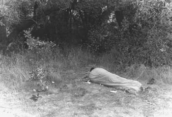 SKIPPY MOVES THE ANKLE gingerly, in pained arcs, and walks with a cane. He says he worked until a year and a half ago "pounding nails," paid under the table, until he found it impossible to continue because of the injury. He was married and lived in an apartment "over on the Eastside," he says, but he doesn't give an address, and the various friends who drop by don't remember the place. One who stays a short while, who asks to be called Baby, refuses to say much about the house, and after a few tries I don't ask anymore. He has a fancy backpack and wears mascara above and below his eyes, a garish penumbra of glittery blue that reminds me of Daryl Hannah in Bladerunner.