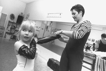 Sleeve Well-Enough Alone: Shelly Hepburn, Vegas showgirl turned SC dance teacher, helps student Olivia Ambris, 5, don a pair of gloves.