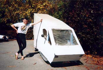 Before he moved to Santa Cruz, Bicycle Bill had already built more than seven pedal-powered vehicles. His favorite, "The Spirit of Bucky Fuller" (named after the fuel-efficient car Buckminster Fuller invented in the 1930s), could travel across the city of Sacramento in 30 minutes. Creating a "body shell" for Bucky gave it better aerodynamics and doubled its speed, Bill explains.