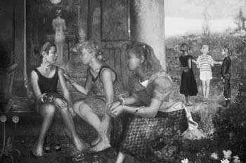 In these monumental works, two mysterious figures conduct secret negotiations in the middle of an enchanted landscape. Through dozens of works these two women--metaphors for the forces of darkness and light, innocence and experience--meet in various guises. Each succeeding painting mirrors past ones so that Galuszka's arsenal of icons appears to mutate like cells unraveling in the most beautiful way possible.
