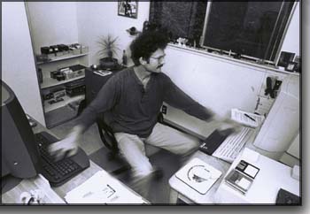 Keyboard Soloist: The author, Aptos telecommuter Tom Bentley, shows off his ten-digit mastery of the computer keyboards in his bedroom office.