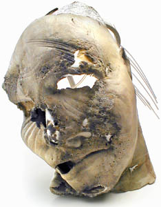 The puppets are just as ornate on the inside, where tubes, strings and levers intertwine like nerves. Instead of using fiberglass for the skulls, Caruso ground up plastic bags and added wood glue. Articulate hands made of plexiglass, small pieces of plastic from milk crates and guitar wire are capable of picking up small Styrofoam cups. Pink-gummed dentures heighten the level of realism. To face Caruso's collection is to confront strange, unsettling entities that seem all the more alive for being capable of such authentic death.