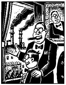 In low moments, I sympathize, but the best things in Eye of The Beholder are not the straight political commentary but Kuper's more comic work. A portly boss shows off his Expressionist hell-factory to his little princeling, an miniature twin of the plutocrat. The old man is making a gesture that says, 'Someday, this will all be yours.'