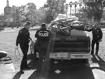 But soon Mama Faye's pile drew the attention of neighbors, who complained to the police about the eyesore. Finally on Jan. 2, San Jose Police officers were sent to the scene, slapped on the latex gloves, arrested the diminutive Mama Faye, dismantled the mound and carted everything away in a Ford Bronco and an extended-cab pickup. Park residents kept a safe distance during the commotion.