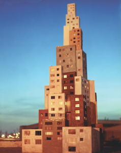 In a large, darkened room, past illuminated signs for the Red Head Piano Bar and the Edison Hotel, Snelling has assembled two miniature high-rise apartment buildings out of a grab-bag of materialswood, plaster, wire, chips of colored plastic, photographs of facades. The one called Tenement is a bit over 6 feet high; Downtown about 4 feet. These seedy residences of the last resort look like architectural models gone to ruin, with peeling paint, tiny strands of dented chain-link fencing, roofs, clotheslines hung with tiny garments.