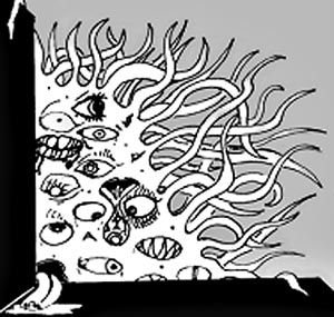 Sleeping far beneath the ocean, Lovecraft's Cthulhu is part of an ancient, intelligent race whose minions (the Deep Ones) colonized Earth long before humans evolved. When Cthulhu awakens--as he does in Lovecraft's short story "Call of Cthulhu"--he causes humans to dream of geometrically incomprehensible cities, pre-human forms of icky sex and other "eldrich horrors." Anyone who beholds him is driven utterly, completely, wildly insane.