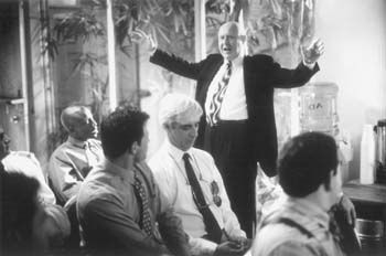 Danny DeVito has a terrific speech about the nature of honesty at the end of this on-again, off-again film. A trio of industrial-lubrication salesmen--Phil (DeVito), Larry (Kevin Spacey) and young Bob (Peter Facinelli)--meet at a hospitality suite at the best hotel in Wichita for a reception. Unfortunately, their would-be client gets away when it turns out that Bob is more interested in witnessing as a Christian than bringing home the sale. Director John Swanbeck adapts Roger Hueff's Hospitality Suite for what is essentially a filmed play. The problem? The play is uneven, stunted from growing in the shadow of David Mamet. The coarseness of the salesmen's talk seems all the more gratuitous when the play gets pious, and it gets very pious indeed. How pious? So pious that it obscures the unignorable fact that evangelical Christianity has been used as a sales technique for decades. Thus young Bob's qualms about mixing sales and religion seem hard to believe. Spacey, looking gaunt, coasts through this morality play on star power. (RvB)