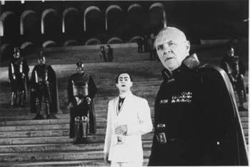 Dante Ferretti's production design offers a hackneyed mix of new fascist motifs with ancient Roman touches--although there is a dandy orgy room with murals based on Attic vases and a Pantheon-style open roof.