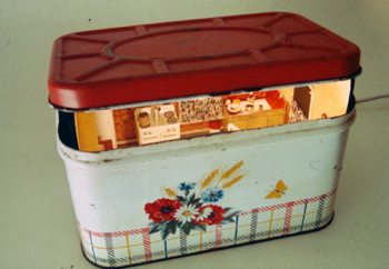 Alternative Universe: Helen Cohen's 'Red Cover Bread Box, Vintage 1940' (1996) features a miniaturized kitchen set inside a tin container.