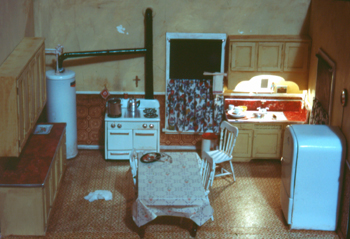 In the exhibit's centerpiece, Liza Lou¹s Kitchen, reproduces that familiar space, including a crowded breakfast table, in minute bursting color using millions of tiny, shimmering tubular beads glued to the walls, floors and countertops. It's all there--from the pie in the oven to the bowl of cereal on the table--rendered with a kind of obsessive ness that is both awe-inspiring and a little frightening. The piece is dated 19911995, although it's hard to believe that it didn't take at least a decade to finish. Lou has turned the traditional woman's prison into a ritual room as ornate and powerful as the elaborate beaded headdress of a cult priestess.
