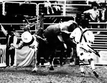 It's these hazardous events, especially the harrowing bull riding, which have increased rodeo's popularity in recent years. And when you're watching a cowboy get tossed around by these enormous animals, and you see the broken bones and the piddly payoffs and the shit-tough nomadic life these cowboys lead--that is, when you compare the lives of the animals with that of their cowboys--it becomes a pretty tough call who really gets the sharp end of the spur.