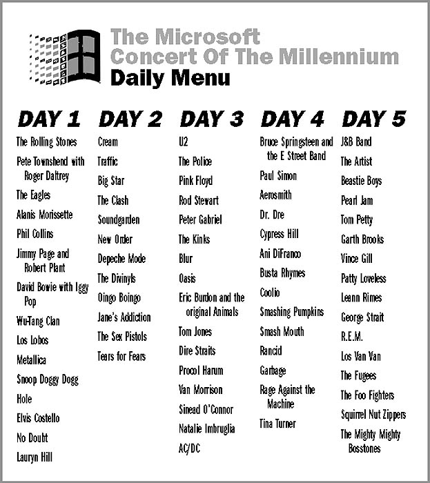 It is with great pride that William (Bill) H. Gates III, Chairman and CEO of Microsoft Corporation, announces the largest rock & roll extravaganza of all time, The Microsoft Concert Of The Millennium, to take place April 21-25, 1999.