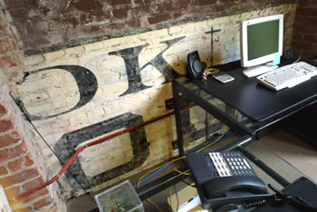 The sign gods must've been crazy. I had discovered Metropole, and now I was off again, looking for another hand-painted sign in the building that Ray Giese gold-leafed. A girl pages Bella Mia owner Bill Carlson, and 10 minutes later Carlson comes down from his office holding two pieces of paper: one is an old photograph of 52 and 58 S. First, and the other is an artist's rendering of the two stores, a pharmacy and E. Guppy's Bookstore. "I know what you're talking about. I let the guys on the third floor know we're coming." Design Reactor is a web-design firm brimming with twentysomething, V-neck sweater and jeans guys and gals in a cubicle-free environment, which actually complements the brick walls. I explain my reason for the visit and instantly feed my sign appetite. At the back of the room, close to the two glass windows, is the hand-painted, slightly faded sign. In the fade of the brick wall, I can make out three lines of white letters: "GUPPY. BOOKS. STATIONER." Underneath the stacked three words, I observe that this portion has been painted over at least once. Against a white background, black block letters stand out: "OOK." And beneath it, "OODS." Carlson tells me later that the side of the building with the sign was constructed in 1870. The adjacent building, the one housing Design Reactor, was built in 1872, says Carlson. "Man, we were trying to figure out what this meant," says Jeff Dumo, director of new business. "That's pretty cool."